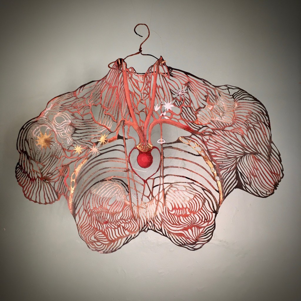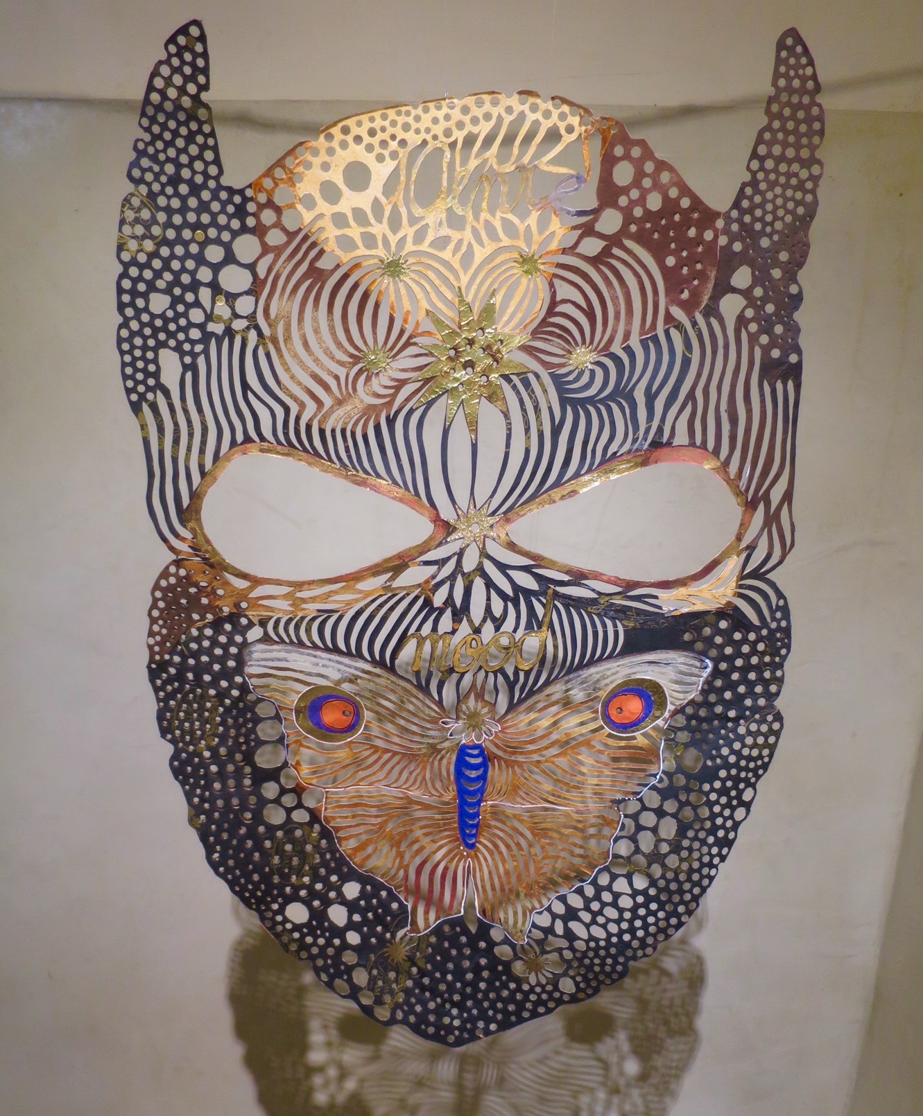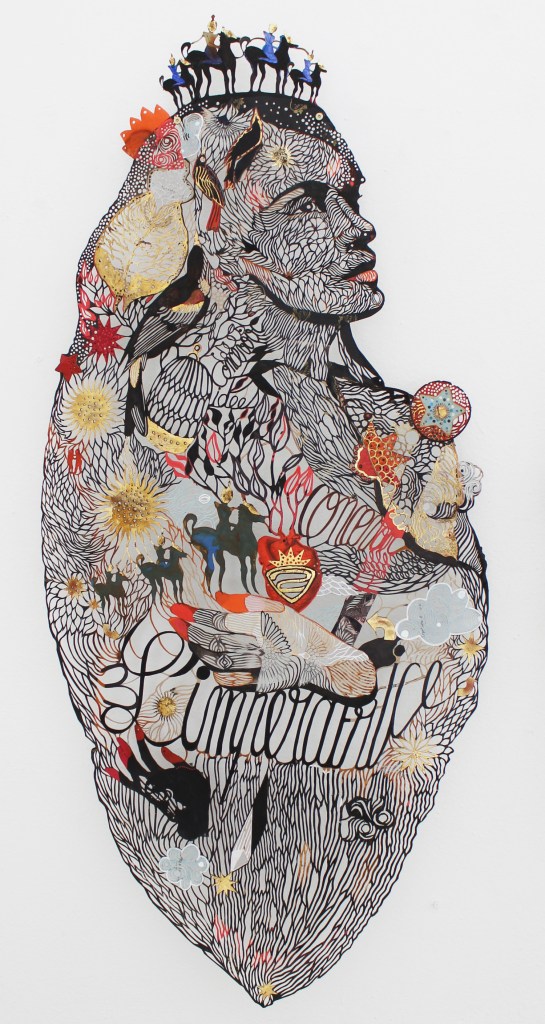 Le papier est un matériau de résilience par excellence; rejeté, ordinaire ou abîmé, on peut, par la magie de la collecte, du collage, de la découpe, le transmuter en un matériau au service du dessin ; matériau servant à la fois de support et de matérialisation de la ligne même du trait du dessin. La part artisanale prédomine et structure à la fois mes créations. Les couleurs des papiers utilisés déterminent celles de mes œuvres. Seul mon cutter découpe de façon spontanée les interstices entre les dessins. Je tente de développer un dessin entre ombre et lumière, entre matière et surface, à l’instar du mythe de Dibutade dont la fille trace sur le mur le contour de l’ombre de son amant pour en conserver un souvenir. Je suis influencée par les images archétypales des cultures populaires artistiques et artisanales, du sacré de l’Orient et de l’Occident et celles des arts urbains. Je travaille à élaborer une écriture plastique qui soit comme un souffle, malgré la complexité de sa trame iconographique, qui soit un lien entre l’élan de vie et la répétition de l’activité humaine quotidienne.